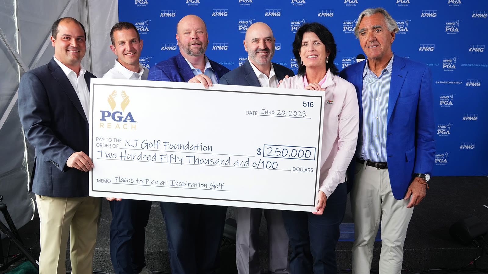 The donation, presented at the 2023 KPMG Women’s PGA Championship at Baltusrol Golf Club, will be used in part to construct a roof over the 27-bay teeing ground of the driving range, enabling protection from the elements, as well as eco-friendly lights and heaters. It will also be used to install drainage systems on the property to care for a new natural grass tee that will enhance the teaching operation for PGA Professionals.